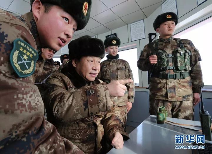 2014年1月26日,习近平专程来到内蒙古军区边防某部,亲切看望慰问戍边官兵。这是习近平仔细察看三角山哨所执勤设施,动情地对执勤哨兵说:“今天,我和你们一起执勤站岗。”新华社记者 李刚 摄
