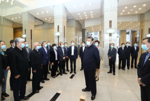 4月19日,在清华大学建校110周年校庆日即将来临之际,中共中央总书记、国家主席、中央军委主席习近平来到清华大学考察。这是习近平在清华大学主楼二层大厅看望部分老教授、中青年骨干教师代表并同他们亲切交谈。新华社记者 鞠鹏 摄