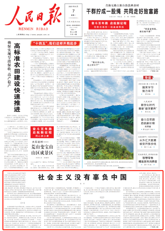 人民日报头版刊发“宣言”署名文章《社会主义没有辜负中国》。文章指出,走过风霜雪雨,创造人间奇迹,我们有义务用胜利告慰先烈:社会主义没有辜负中国!我们有责任让历史告诉未来:社会主义不会辜负中国!