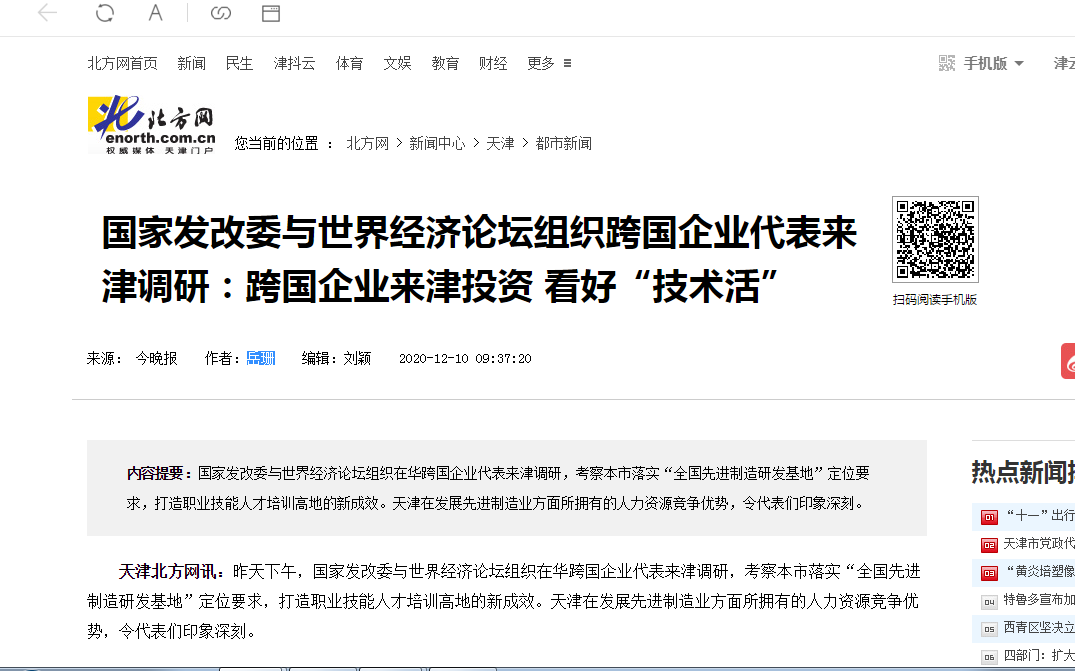 天津北方网讯:昨天下午,国家发改委与世界经济论坛组织在华跨国企业代表来津调研,考察本市落实“全国先进制造研发基地”定位要求,打造职业技能人才培训高地的新成效。天津在发展先进制造业方面所拥有的人力资源竞争优势,令代表们印象深刻。