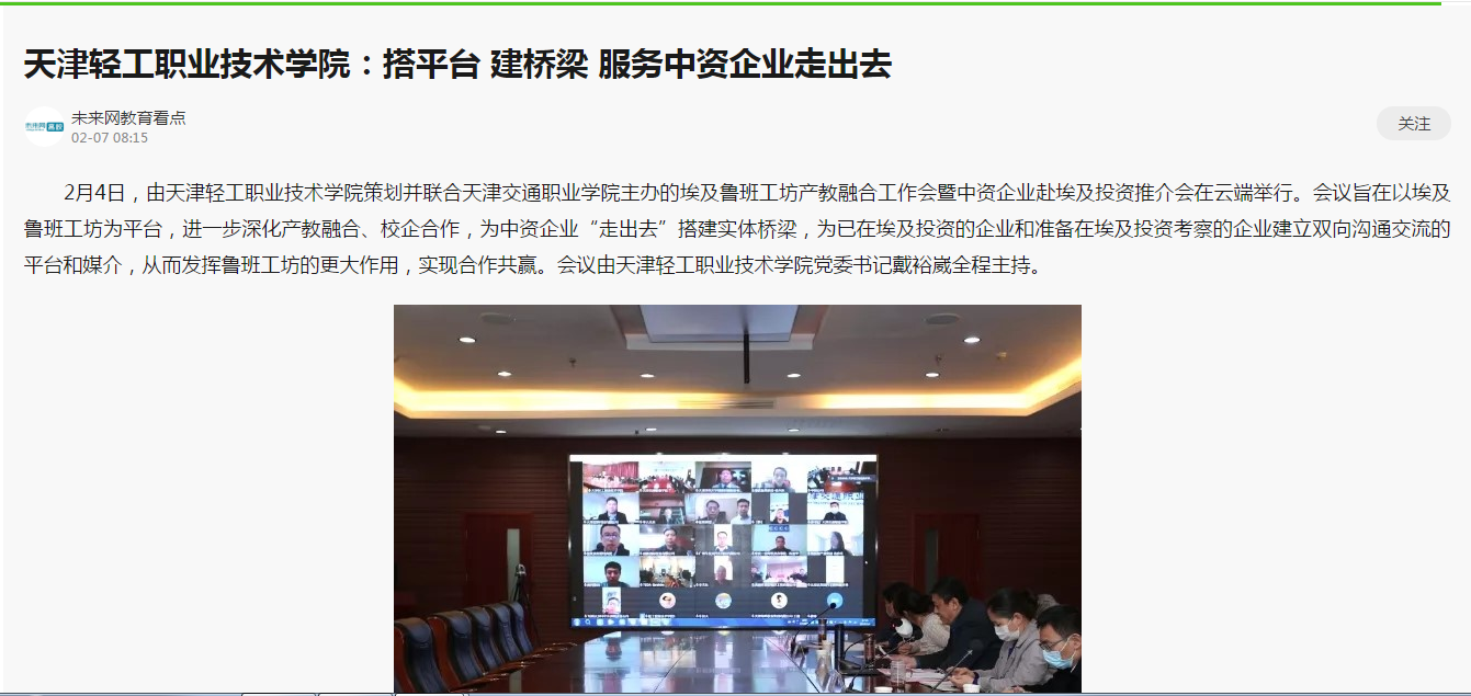 中国驻埃及使馆教科处公参王胜刚及庞博、经商处李运雷,天津市教委职教处处长李力,中埃·泰达苏伊士经贸合作区执行董事魏建青等23家企业共33人在线上参加会议;天津交通职业学院党委书记苏敬、副院长孙希月以及两所院校承担埃及鲁班工坊建设的相关处室和专业负责人一并参会。