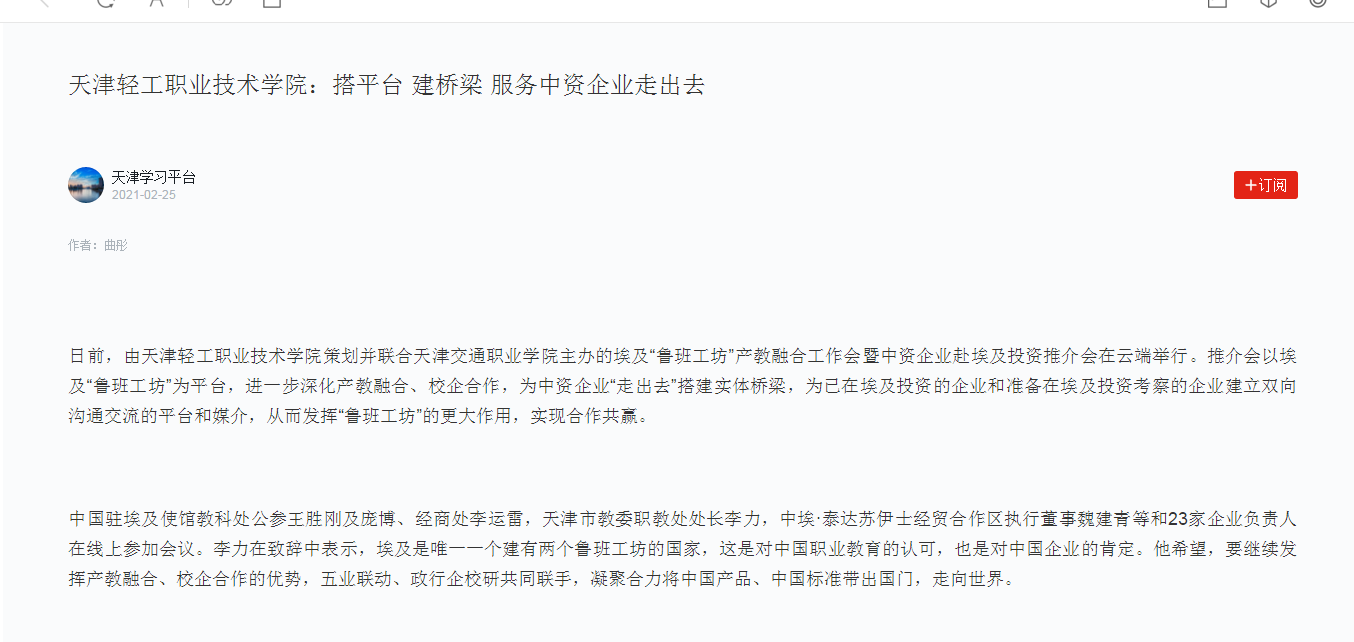 中国驻埃及使馆教科处公参王胜刚及庞博、经商处李运雷,天津市教委职教处处长李力,中埃·泰达苏伊士经贸合作区执行董事魏建青等和23家企业负责人在线上参加会议。李力在致辞中表示,埃及是唯一一个建有两个鲁班工坊的国家,这是对中国职业教育的认可,也是对中国企业的肯定。他希望,要继续发挥产教融合、校企合作的优势,五业联动、政行企校研共同联手,凝聚合力将中国产品、中国标准带出国门,走向世界。
