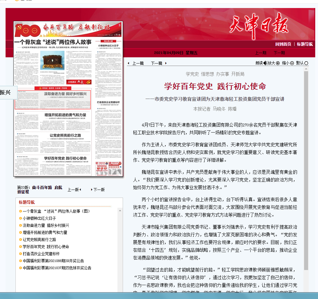 4月7日下午,来自天津渤海轻工投资集团有限公司的270余名党员干部聚集在新利18平台报告厅内,共同聆听了一场精彩的党史专题宣讲。