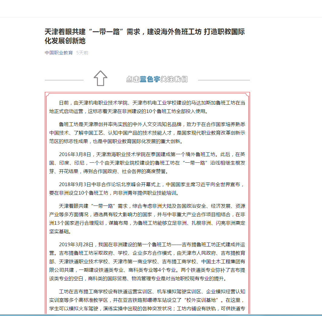 | 中国职业教育:天津着眼共建“一带一路”需求,建设海外鲁班工坊 打造职教国际化发展创新地 |