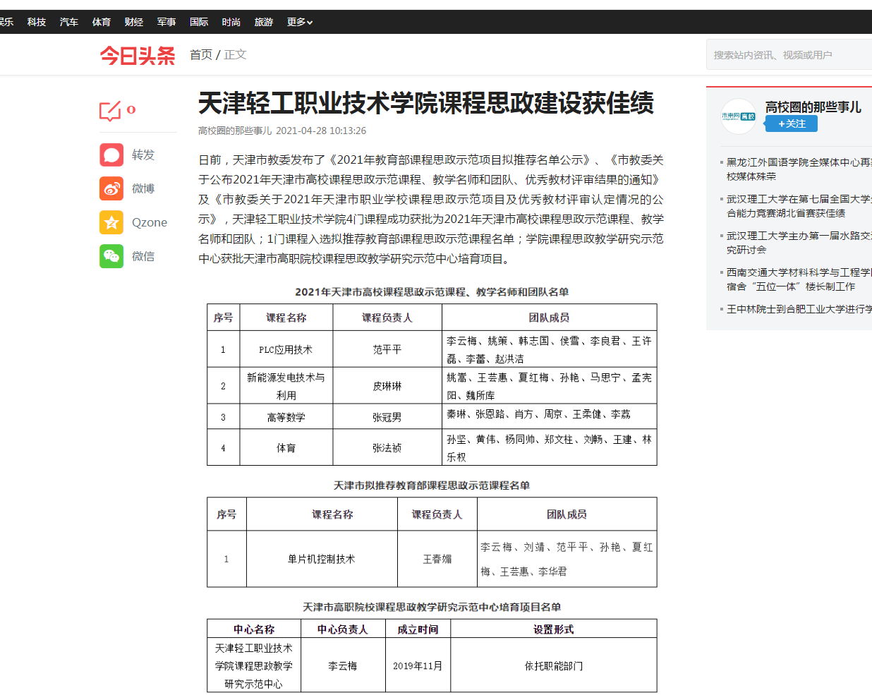 日前,天津市教委发布了《2021年教育部课程思政示范项目拟推荐名单公示》、《市教委关于公布2021年天津市高校课程思政示范课程、教学名师和团队、优秀教材评审结果的通知》及《市教委关于2021年天津市职业学校课程思政示范项目及优秀教材评审认定情况的公示》,新利18平台4门课程成功获批为2021年天津市高校课程思政示范课程、教学名师和团队;1门课程入选拟推荐教育部课程思政示范课程名单;学院课程思政教学研究示范中心获批天津市高职院校课程思政教学研究示范中心培育项目。