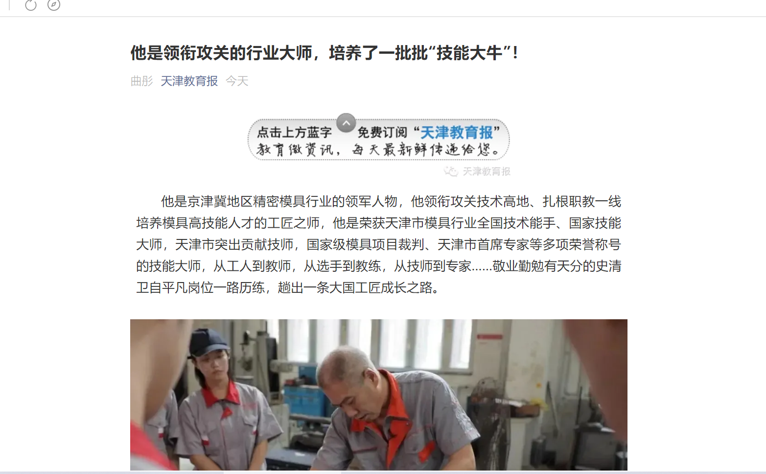 | 《 天津教育报》:他是领衔攻关的行业大师,培养了一批批“技能大牛”! |