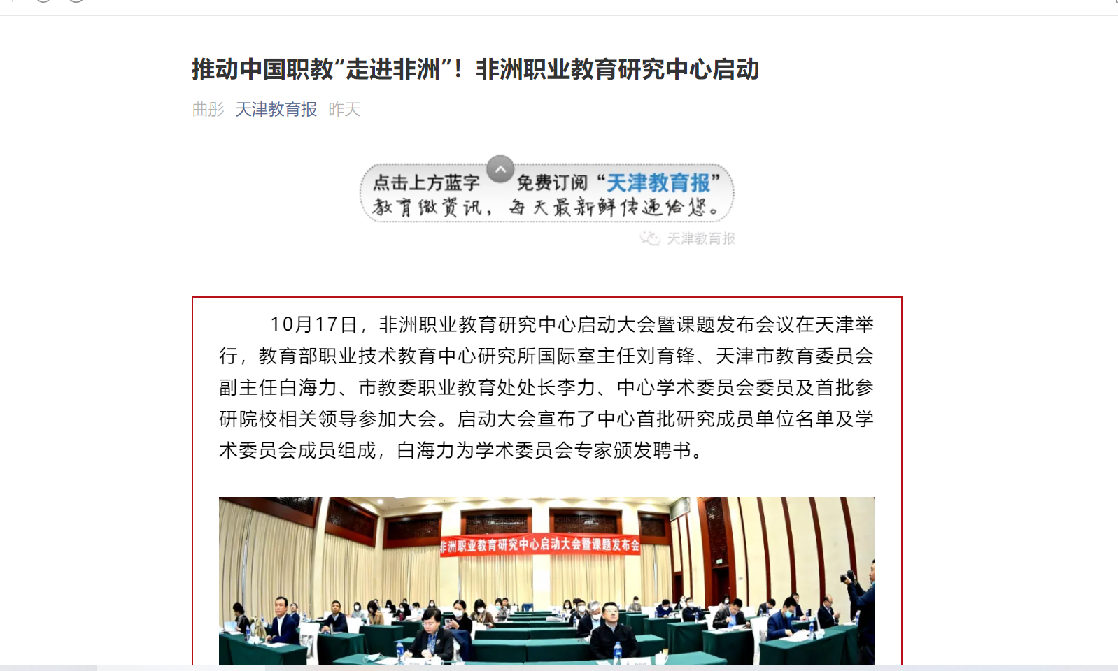 10月17日,非洲职业教育研究中心启动大会暨课题发布会议在天津举行,教育部职业技术教育中心研究所国际室主任刘育锋、天津市教育委员会副主任白海力、市教委职业教育处处长李力、中心学术委员会委员及首批参研院校相关领导参加大会。启动大会宣布了中心首批研究成员单位名单及学术委员会成员组成,白海力为学术委员会专家颁发聘书。