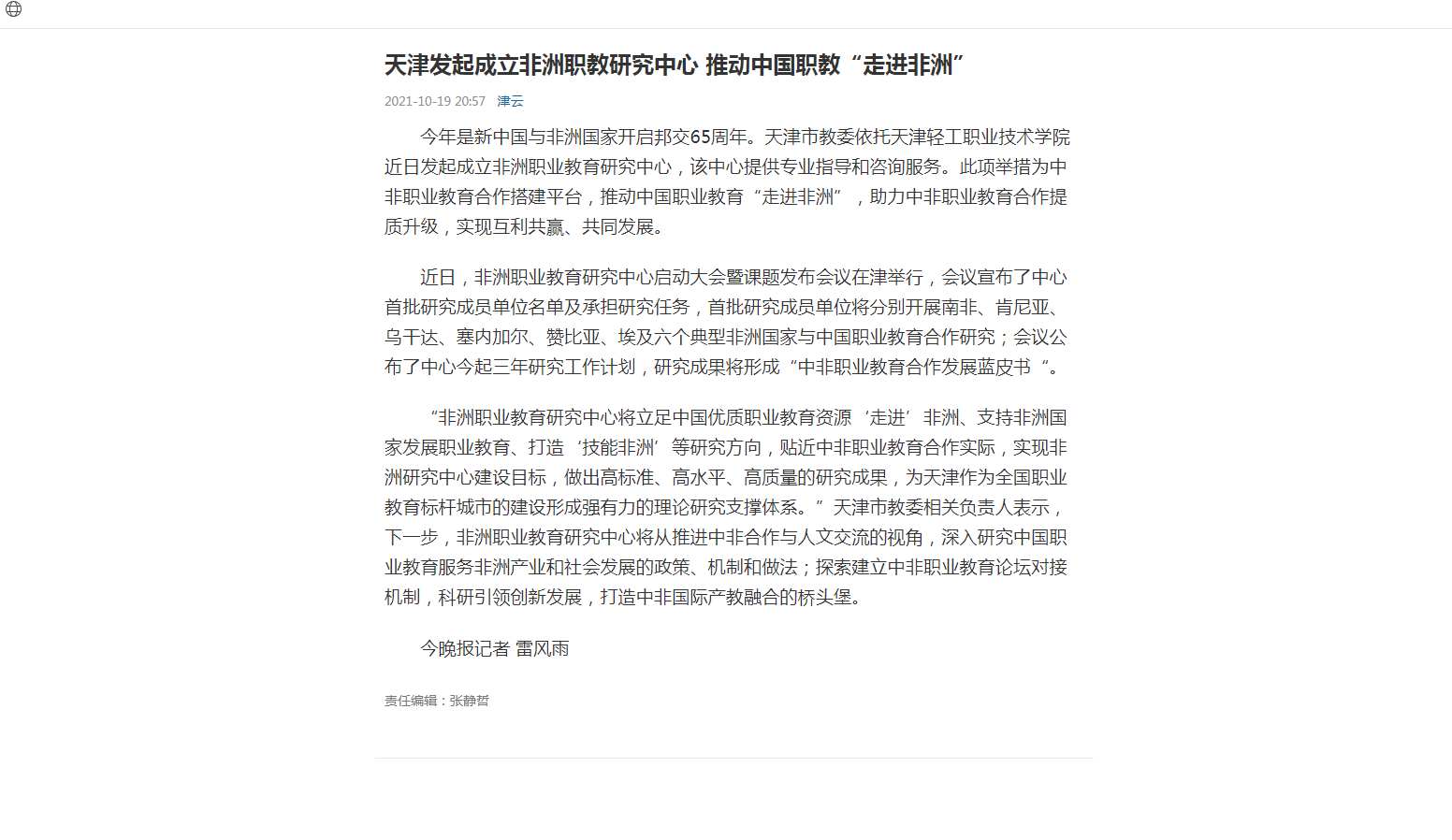 “非洲职业教育研究中心将立足中国优质职业教育资源‘走进’非洲、支持非洲国家发展职业教育、打造‘技能非洲’等研究方向,贴近中非职业教育合作实际,实现非洲研究中心建设目标,做出高标准、高水平、高质量的研究成果,为天津作为全国职业教育标杆城市的建设形成强有力的理论研究支撑体系。”天津市教委相关负责人表示,下一步,非洲职业教育研究中心将从推进中非合作与人文交流的视角,深入研究中国职业教育服务非洲产业和社会发展的政策、机制和做法;探索建立中非职业教育论坛对接机制,科研引领创新发展,打造中非国际产教融合的桥头堡。