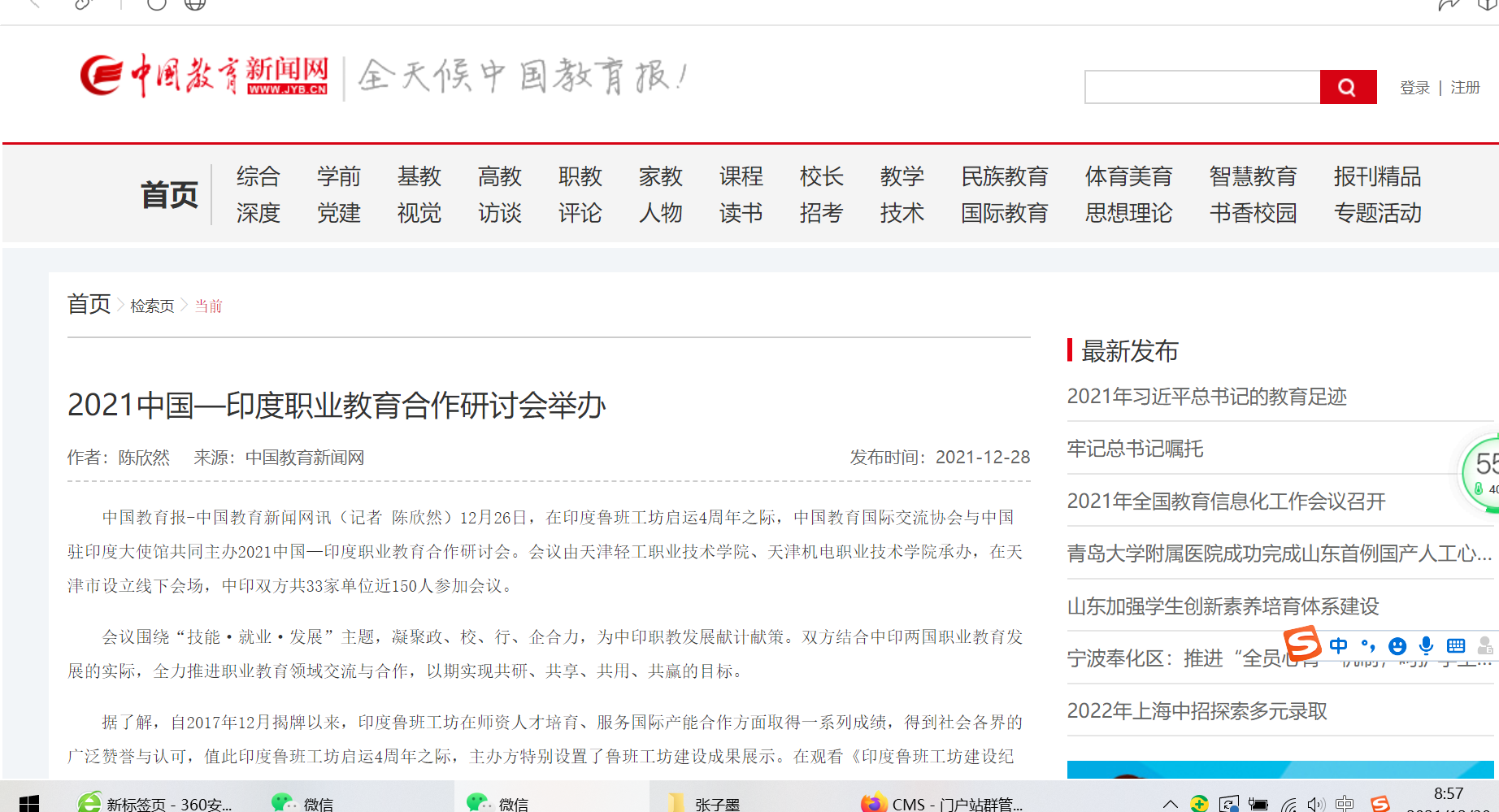 中国教育报-中国教育新闻网讯(记者 陈欣然)12月26日,在印度鲁班工坊启运4周年之际,中国教育国际交流协会与中国驻印度大使馆共同主办2021中国—印度职业教育合作研讨会。会议由新利18平台、天津机电职业技术学院承办,在天津市设立线下会场,中印双方共33家单位近150人参加会议。