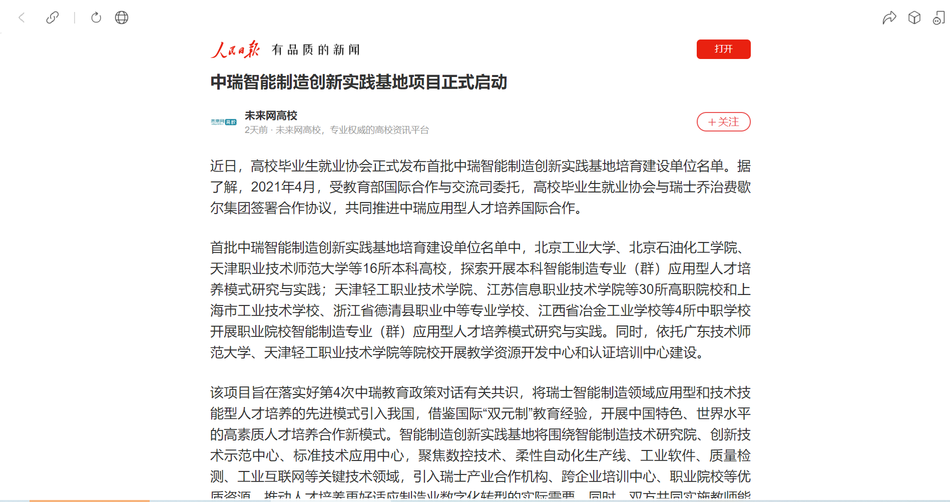 近日,高校毕业生就业协会正式发布首批中瑞智能制造创新实践基地培育建设单位名单。据了解,2021年4月,受教育部国际合作与交流司委托,高校毕业生就业协会与瑞士乔治费歇尔集团签署合作协议,共同推进中瑞应用型人才培养国际合作。