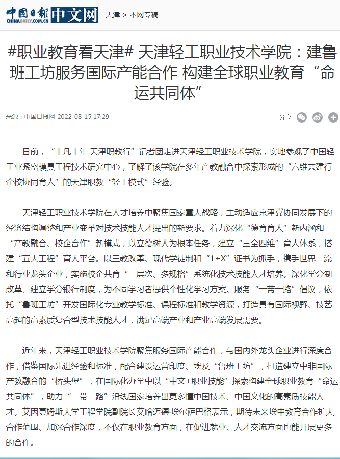近年来,新利18平台聚焦服务国际产能合作,与国内外龙头企业进行深度合作,借鉴国际先进经验和标准,配合建设运营印度、埃及“鲁班工坊”,打造建立中非国际产教融合的“桥头堡”,在国际化办学中以“中文+职业技能”探索构建全球职业教育“命运共同体”,助力“一带一路”沿线国家培养出更多懂中国技术、中国文化的高素质技能人才。艾因夏姆斯大学工程学院副院长艾哈迈德·埃尔萨巴格表示,期待未来埃中教育合作扩大合作范围、加深合作深度,不仅在职业教育方面,在促进就业、人才交流方面也能开展更多的合作。