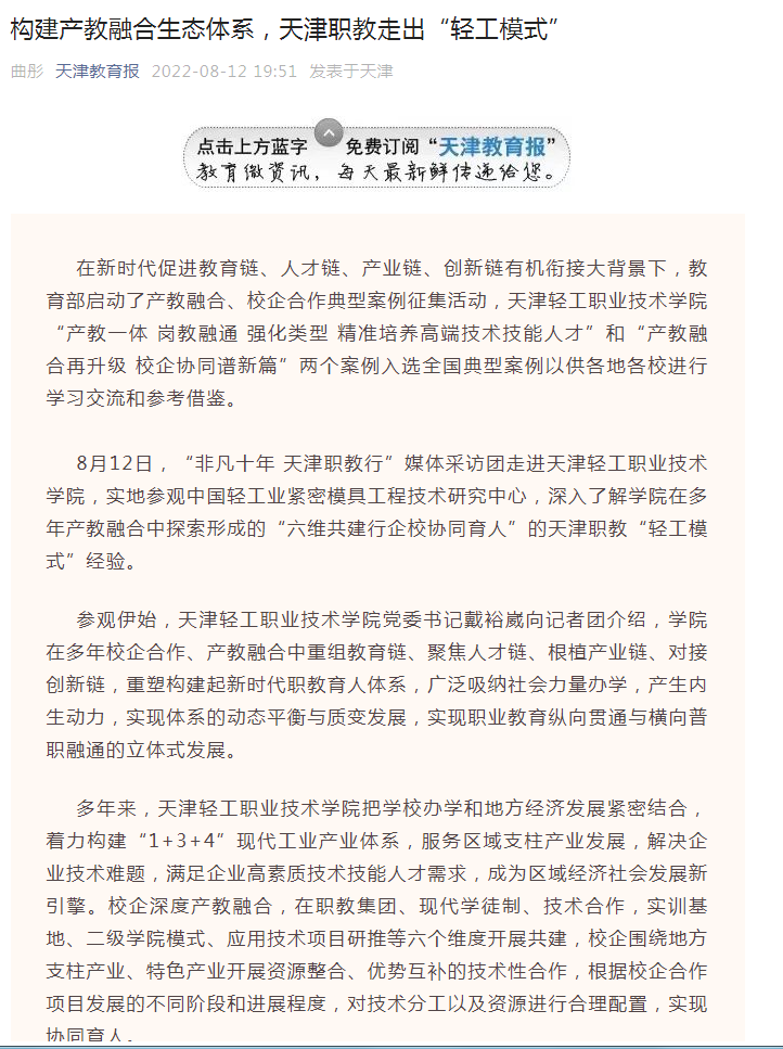 天津教育报:构建产教融合生态体系,天津职教走出“轻工模式”