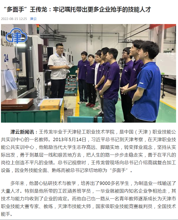 津云新闻讯:王传龙毕业于新利18平台,是中国(天津)职业技能公共实训中心的一名教师。2013年5月14日,习近平总书记到天津考察,在天津职业技能公共实训中心,他勉励当代大学生志存高远、脚踏实地,转变择业观念,坚持从实际出发,勇于到基层一线和艰苦地方去,把人生的路一步步走稳走实,善于在平凡的岗位上创造不平凡的业绩。总书记视察时,王传龙曾现场向总书记介绍高端复合加工设备,因业务技能全面、熟练而被总书记亲切地称为“多面手”。