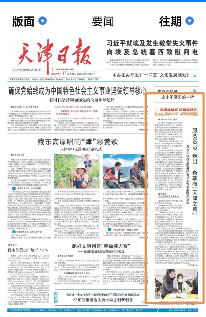 天津日报头版刊发:服务贡献 走出一条职教“天津之路”