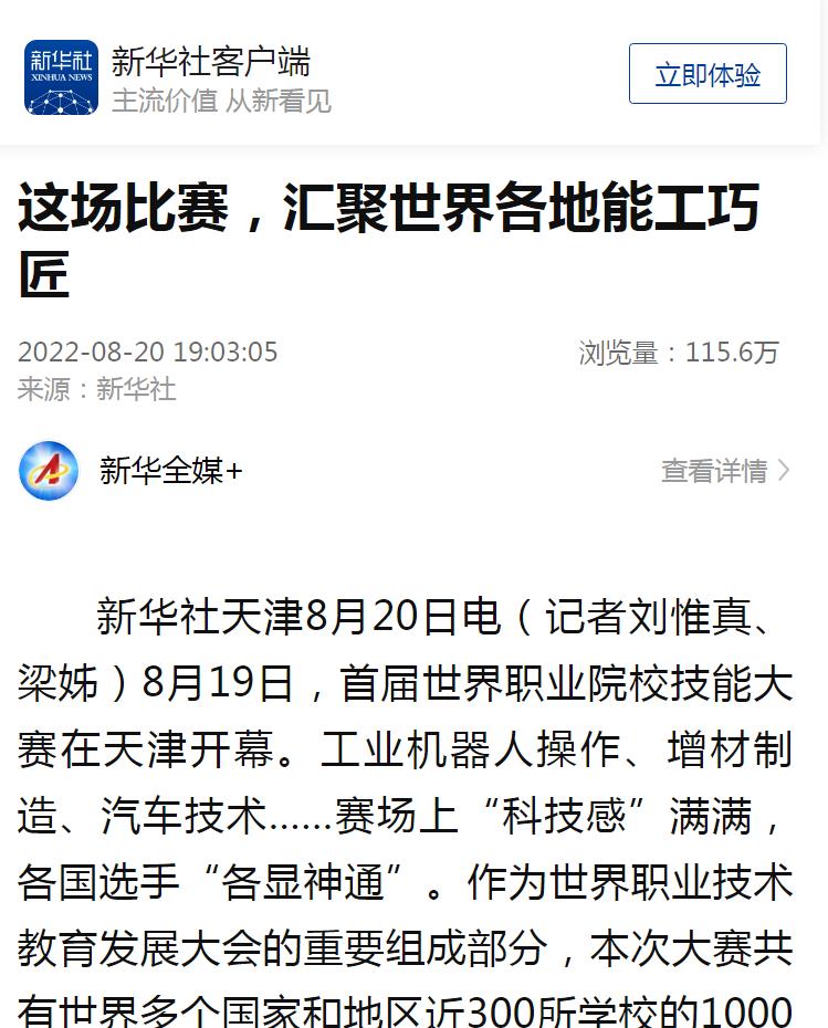 新华社天津8月20日电(记者刘惟真、梁姊)8月19日,首届世界职业院校技能大赛在天津开幕。工业机器人操作、增材制造、汽车技术……赛场上“科技感”满满,各国选手“各显神通”。作为世界职业技术教育发展大会的重要组成部分,本次大赛共有世界多个国家和地区近300所学校的1000多位选手参赛,就23个赛项展开“比拼”。