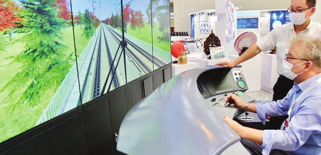 在吉布提鲁班工坊展示区,深圳职业技术学院的顾问、德国教授马丁·弗莱舍尔“驾驶”动车组模拟设备。
