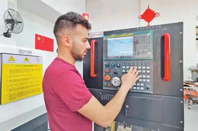 埃及学员在艾因夏姆斯大学鲁班工坊数控设备应用与维护技术实训室学习操作