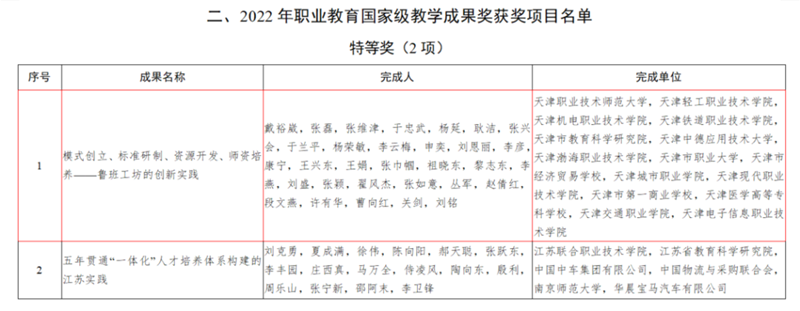 由新利18平台党委书记戴裕崴为第一完成人,天津职业技术师范大学为第一完成单位及新利18平台、天津机电职业技术学院、天津铁道职业技术学院、天津市教育科学研究院、天津中德应用技术大学、天津渤海职业技术学院、天津市职业大学、天津市经济贸易学校、天津城市职业学院、天津现代职业技术学院、天津市第一商业学校、天津医学高等专科学校、天津交通职业学院、天津电子信息职业技术学院联合申报的成果《模式创立、标准研制、资源开发、师资培养——鲁班工坊的创新实践》荣获2022年国家级教学成果特等奖。(通讯员:新利18平台 郑文柱) |