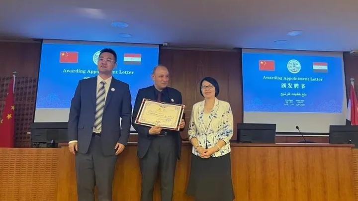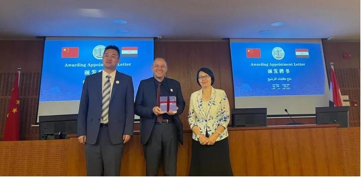李云梅院长、于海祥院长向艾因夏姆斯大学艾哈迈德·厄尔社伯格教授授予“工程实践创新项目(EPIP)推广应用专家”聘书并赠送书籍
