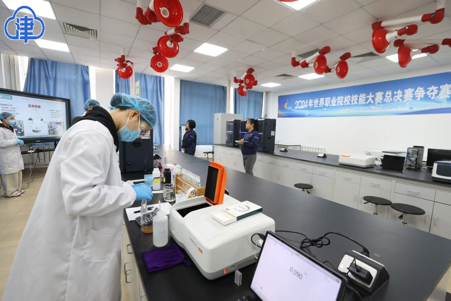 “这是我们采集的水样,现在进行样本污染物的检测……”在天津现代职业技术学院理化分析测试中心,2024年世界职业院校技能大赛资源环境与安全赛道三赛道(环境检测与监测组)争夺赛金奖的选手们正在紧张地忙碌着。