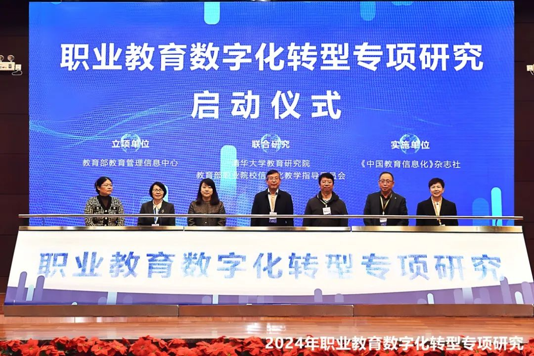 在各位领导和嘉宾的见证下,2024年职业教育数字化转型专项研究正式启动。职业教育数字化专项研究作为中国智慧教育区域发展研究的组成部分,是由教育部教育管理信息中心立项,《中国教育信息化》杂志社联合教育部职业教育信息化教学指导委员会、清华大学教育研究院,以及全国多个省市职业教育研究机构共同参与的研究项目。