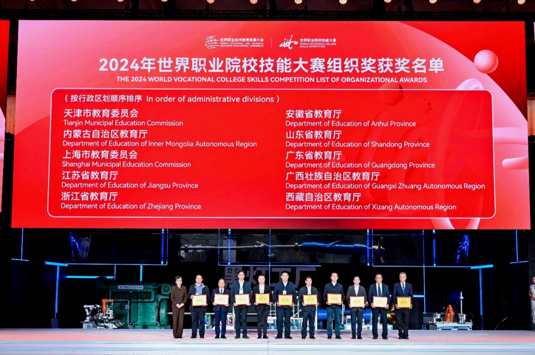 中国职业技术教育学会会长、教育部原副部长鲁昕作为大赛组委会代表,为2024年大赛作出突出贡献的10个省级教育行政部门颁发组织奖。
