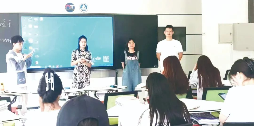今年9月,2022级和田联合培养班学生古丽米热(左二)和同学在电子商务专业课上作展示交流。