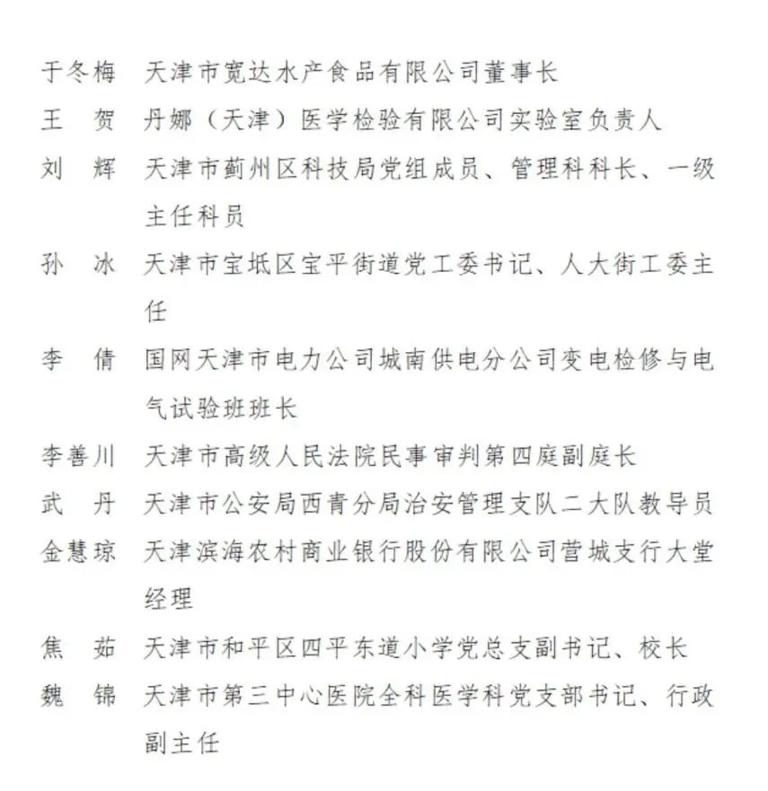 为表彰先进、树立榜样,激励广大妇女自尊自信、自立自强,奋进新征程、建功新时代,市妇联决定,授予于冬梅等10名同志“天津市三八红旗手标兵”称号,授予张宝颖等193名同志“天津市三八红旗手”称号,授予天津市滨海新区文物保护与旅游服务中心等97个单位“天津市三八红旗集体”称号。