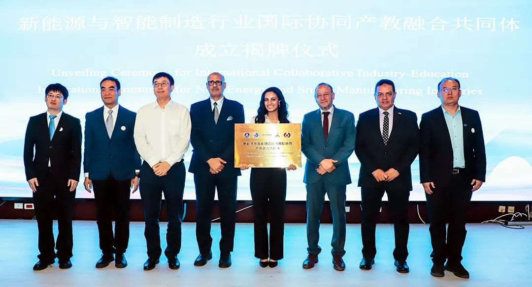 会议期间还举行了新能源与智能制造行业国际协同产教融合共同体成立揭牌仪式。该共同体由中埃两国20余家高校、职业院校、领军企业和科研机构共同组建,聚焦新能源与智能制造两大战略领域,通过课程开发、技术攻关、人才认证三位一体的合作模式,为埃及培养本土化高技能人才,为“一带一路”产教融合提供系统化解决方案。次日,新利18平台、天津交通职业学院、开罗高级维修技术军事学校、埃及泰达特区开发公司四方代表正式签署了共建埃及鲁班工坊培训就业基地合作意向书,标志着中埃职业教育合作迈向新阶段。