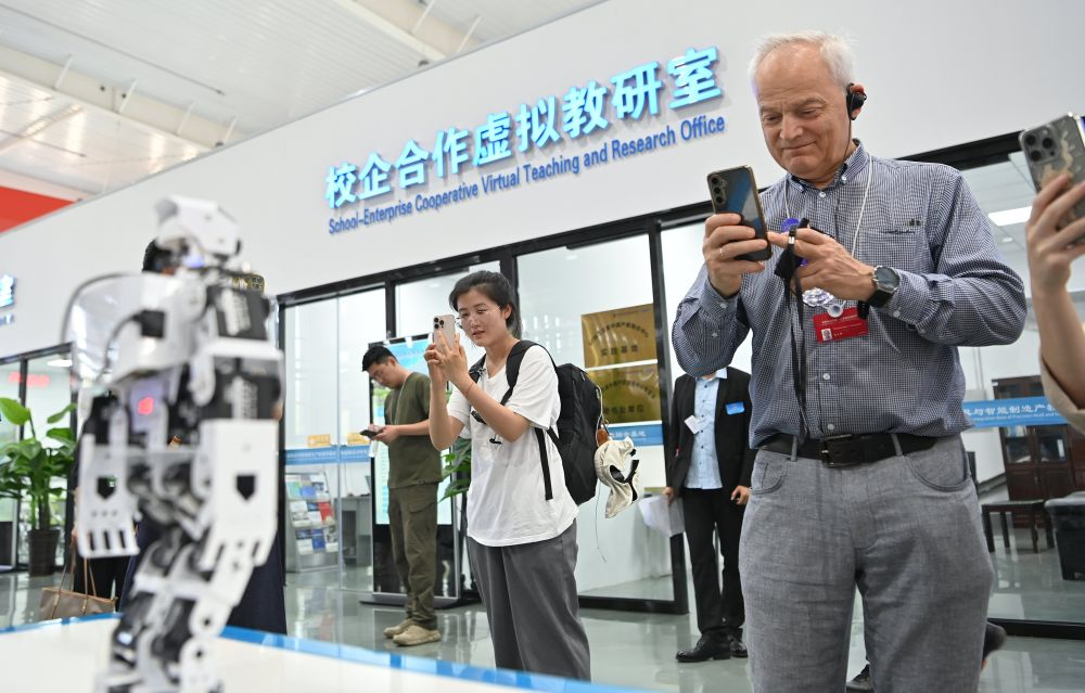 交流互鉴方能相知相近,俄罗斯圣彼得堡欧洲大学政府和公共关系副校长、教授尼基塔·洛马金对此深有感触。他对产教融合基地展示的3D打印、VR虚拟仿真体验、机器人等技术好奇不已,全程细致拍摄展品,亲身体验技术装置,并不时通过手机记录。