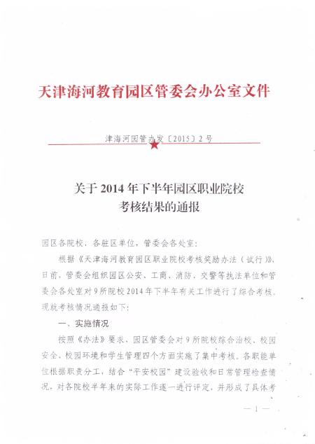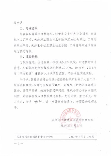 根据《天津海河教育园区职业院校考核奖励办法(试行)》,园区管委会组织管委会各处室及驻园区公安、工商、消防、交警等有关单位,对园区内9所院校2014年下半年工作在综合治校、校园安全、校园环境和学生管理等四个方面实施了集中考核。综合各职能单位考核意见,并经管委会主任办公会同意,我院被评定为优秀等次,获奖励20万元。