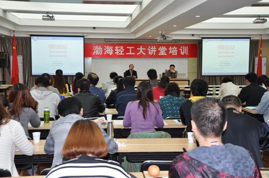 首先,渤海集团人力资源部陈永新科长发言,他提出为进一步推动全系统专业技术人才和中层管理人员的知识更新,全面做好素质工程提升教育,充分运用院校培训资源,2015年度集团将继续在系统内组织开展“渤海轻工大讲堂”系列培训课程。同时还向各企业中层管理人员介绍了我院的“百万福利培训计划”,并发放了宣传手册。