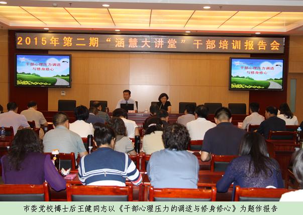 为深入学习十八届四中全会精神,落实“三严三实”专题教育的要求,切实推进依法治校工作的开展,加快提高我院中层干部的思维、决策、履职和身心健康的能力与水平,学院党委于2015年9月2日组织举办了“涵慧大讲堂”第二期干部培训报告会。这期报告会的主题是“践行三严三实要求,提升中层干部的身心修养水平,促进依法治校建设”。在上午的报告会上,市委党校王俊博士后以《以加强制度建设为抓手促进依法治校》为题作了报告。王教授以深入浅出的方式分析了新形势下,依法治校的重要意义,报告内容详实,观点鲜明,对于深刻领会十八届四中全会精神,树立依法治校的观念,推动学院各项工作在法治和制度的轨道内持续健康发展提供了重要的理论依据。市委党校王健博士后在下午的报告会以《干部心理压力的调适与修身修心》为题作了报告。王教授从领导干部心理压力的主要来源入手,运用通俗易懂的语言、鲜活生动的案例,将深奥的理论知识与现实生活中的实例相结合,对当前领导干部存在的心理现状作了独到的分析,并就在实际工作中如何排解压力、调节心理、保持积极健康的心态作了详细的阐述,为领导干部今后能够以乐观向上、积极健康的心态开展工作起到了重要作用。两位教授的报告引发了听众的共鸣。