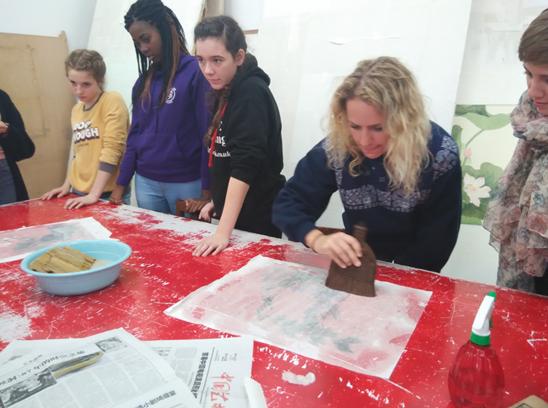 参观完毕后,刘院长带领留学生们进入了文物鉴定与修复专业刘宏杰老师的书画装裱课堂。在课堂上,刘老师详细给留学生们讲解了传统中国书画装裱的用具和工序,并现场演示。为了让英国师生们留下更深刻的印象,刘老师和她的学生们将留学生分成组,发给他们工具,手把手带领他们体验书画装裱的制作流程。装裱体验完毕后,学生们兴奋地与各自的“作品”合影留念。