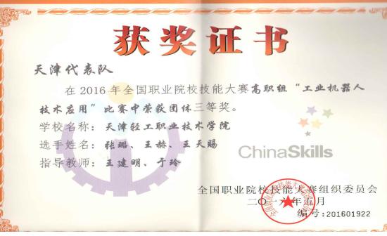 在老师的悉心指导和选手的共同努力下,经过激烈的竞争,最终获得全国大赛工业机器人赛项团体三等奖。本次赛事为我院首次参加的赛事,为今后教学、学生技能培养总结了经验。
