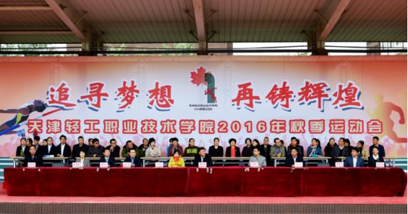“追寻梦想,再铸辉煌”,2016年10月20日,新利18平台举行2016年秋季运动会。开幕式上天津渤海轻工投资集团科技部副部长李芳、天津市教委高职高专处副处长李力以及海河教育园区事业发展局、中德技术应用大学、海运职业学院领导应邀出席,院领导曹燕利、戴裕崴、刘靖华、胡如祥、韩淑君、于洪祥出席并在主席台就座,各二级学院、各部门的负责人、教职工和学生参加开幕式。学院党委副书记、院长戴裕崴致开幕词并为运动会开赛鸣枪。运动会期间,天津市教委副主任吕景泉、高职高专处杨荣敏处长等领导亲临比赛现场指导,并观看了趣味比赛项目。
