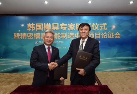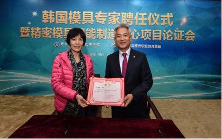2016年12月1日,韩国模具专家聘任仪式暨精密模具智能制造中心项目论证会在我院召开,机械工程学院院长、京津冀模具现代职业教育集团秘书长周树银主持会议。天津市模具工业协会秘书长,天津汽车模具股份有限公司、天津市津兆机电开发有限公司、天津津荣天宇精密机械股份有限公司、天津海鸥表业集团有限公司、天津瑞福天科模具有限公司、欧特克软件(中国)有限公司、天津职业技术师范大学、天津职业大学的相关领导参加了此次会议。