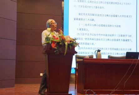 偌大的报告厅挤满听众。王教授准时走上讲台,一开口,王教授先对自己约法三章:“一是站着讲,二是脱稿讲,三是不计报酬”。顿时,台下的学生对这位年过古稀的老人肃然起敬。报告中,王辅成教授声情并茂,旁征博引,为大家详细解读了社会主义核心价值观与大学生的关系。王教授重点解释了为何当代大学生要树立社会主义核心价值观以及告诉大家树立正确“三观”的途径和方法。他表示,教育、引导好青少年关系到国家的前途和未来。但当今社会尤其是青少年中,确实出现了理想偏颇、道德失范等令人担忧的现象,必须大力加强“三观”宣传教育。他以事托理、情理交融,把实例、格言、诗句等融入讲座,一个个鲜活的事例、一句句振聋发聩的格言,让他的演讲言之有物,声声入耳,扣人心扉。在座的同学们都被王教授的演讲打动,全神贯注地聆听着王教授的发言,掌声时时响起。