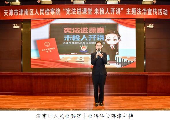 为深入学习贯彻党的十九大和十九届二中、三中全会精神,扎实推进宪法宣传教育进校园,4月27日,学院党委联合津南区人民检察院在我院举办了宪法进校园宣讲报告会,共同签订了海河教育园区首家检校共建法治教育基地协议。海河教育园区社会事业发展局局长张勇、市人民检察院未检办副处长赵文静、津南区人民检察院副检察长孟祥福、未检科科长薛津、院领导曹燕利、胡如祥、韩淑君、思政教育干部职工和学生代表共500余人参加了报告会。