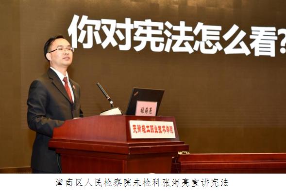 薛津主持了宪法宣传报告会,未检科干警张海亮以“宪法进课堂未检人开讲”为主题做了宪法宣讲。他以快闪的形式开场,向师生宣讲了宪法的由来、新中国宪法发展的历程、宪法的法律地位,通过穿插播放了微视频动画,生动全面的展示了检察机关维护宪法的职责,展现了宪法与公民息息相关的重要作用。深入讲解了国家宪法日的成立、宪法宣誓制度、宪法修改的内容与意义,并结合涉及大学生的案件实例,诠释了宪法的权威与崇高地位。号召师生要深入学习宪法、尊崇宪法、践行宪法,把宪法放在心里、刻在骨里。在宣讲中还通过竞答互动的形式,学生现场谈体会,加深了学生对宪法的理解。