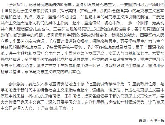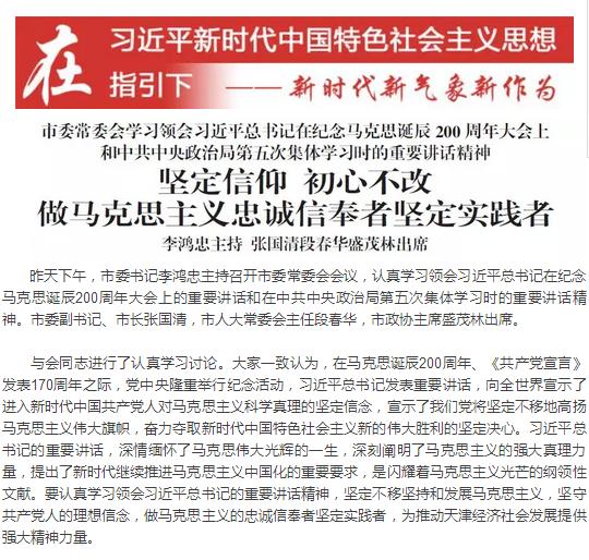 天津市委常委会学习领会习近平总书记在纪念马克思诞辰200周年大会上和中共中央政治局第五次集体学习时的重要讲话精神