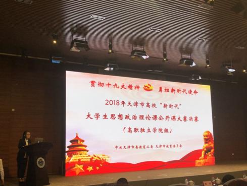 为深入学习宣传习近平新时代中国特色社会主义思想,充分发挥思政政治课在培育和践行社会主义核心价值观中的主渠道作用,加强红色文化教育,提高思政政治理论课的吸引力和感染力,创新学生参与思想政治理论课教学的途径和方法,市委教育工委、市教委主办了“贯彻十九大精神勇担时代使命”为主题的2018年天津市大学生思想政治理论课公开课大赛。比赛分本科组和高职组进行。比赛赛程从 5月到6月8日,分各高校预赛选拔、复赛网上投票、现场抽签决赛三个阶段进行,历时近2个月,来自天津市高职院校的72个团队经过激烈角逐,有15支团队进入决赛。