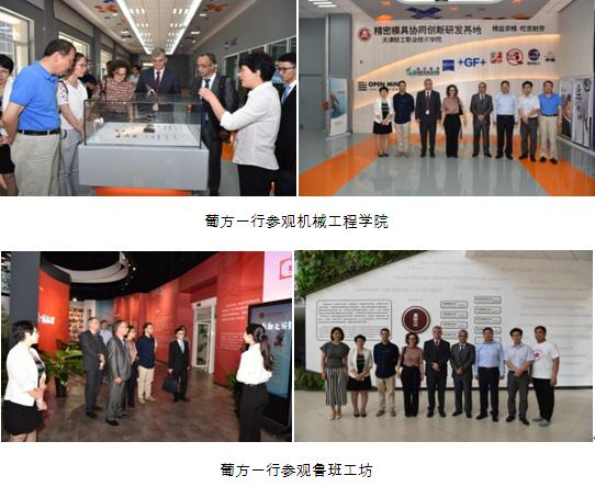 我院首先带领葡萄牙客人来到机械工程学院的精密模具协同创新中心,参观了GF精密模具智能加工生产线并观摩了部分师生作品。葡方对我院校企合作的实训条件和产教融合的教学模式大为赞赏,对我院师生作品中展现的精益求精精神和高超技艺表示赞叹。