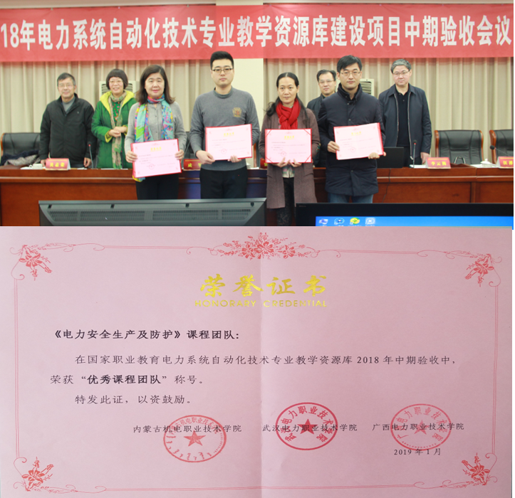 我院朱鹏老师作为电力系统自动化技术专业教学资源库建设课程——《电力安全生产及防护》负责人代表课程团队对课程基本情况、资源建设情况、资源使用情况、资源建设内容、资金使用情况、后期规划等方面作了逐一汇报。在课程建设上得到了专家评审组的高度认可,获得与会评审专家们的一致通过,并在2018年中期验收中获得“优秀课程团队”荣誉称号。