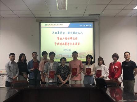2019年9月12日,中秋假期前夕,鲁班工坊讲解社团中秋颁奖暨慰问座谈会于新利18平台行政楼第七会议室召开。我院副院长李云梅、团委副书记刘健、科研处挂职锻炼干部王春媚、教务处/鲁班工坊讲解社团指导教师李超、科研处教师王妍和鲁班工坊讲解社团7名学生代表出席座谈。