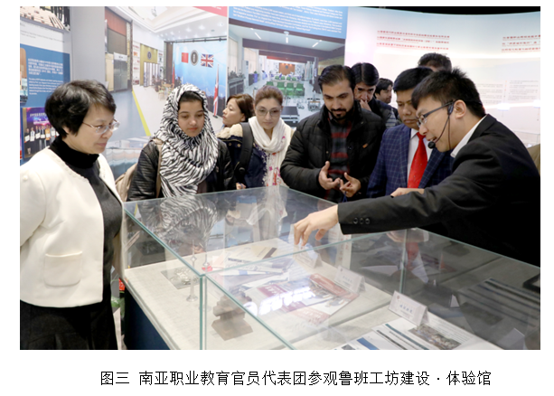 接着,代表团在李云梅副院长的陪同下参观了鲁班工坊建设·体验馆,了解了鲁班工坊的建设历程、建设成效和海外布局。代表团对鲁班工坊在海外建立合作项目,分享中国职教模式的做法表示了极大的称赞,并对鲁班工坊落户自己的国家表达了强烈的期待。
