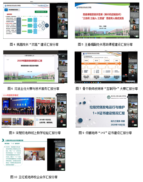 保定电力职业技术学院教师也进行了精彩的汇报,宋慧欣老师作了线上教学情况经验的交流,介绍了保定电力的信息化发展历程,特别是对上半年疫情期间的在线授课实践情况以及取得的成效做了分享。佟鹏老师对“1+X”职业技能等级证书建设做了汇报,详细介绍了保定电力职业技术学院的校企合作背景,书证融通工作的进展,特别对垃圾焚烧发电运行与维护“1+X”证书建设做了详细的介绍,最后从试点院校、骨干专业、资源建设和师资建设四个方面介绍了“1+X”证书建设工作的亮点与特色。最后王红旭老师分享了校企合作的经验,详细介绍了信息系校企合作的发展历程,以及“1+2”的校企合作模式,并对下一步的校企合作计划做了汇报。