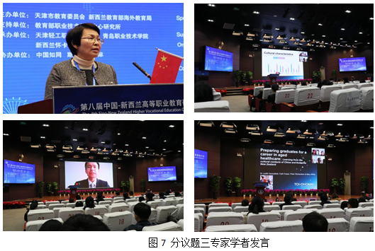 分议题三主题为“创新:线上国际教学合作模式”。高等教育出版社在线职业教育发展中心首席顾问徐刚先生作题为《智慧职教助力国际在线教学的探索与实践》的主题报告;新西兰托伊奥霍迈理工学院朱迪丝·霍尼菲尔德、凯丝·弗雷泽、玛丽·怀特教师作题为《为老年保健行业的毕业生做好准备:中国和新西兰的文化背景比较》的主题报告;天津市教育两委职业教育处李力处长作题为《鲁班工坊——中外人文交流国际知名品牌》的主题报告。
