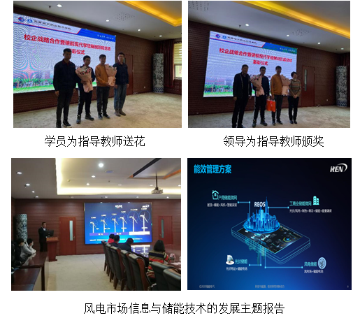颁奖结束后,由企业魏元伟总监与刘鑫工程师分别做了风电市场信息与储能技术发展的专题报告,为学校人才培养开拓了思路。