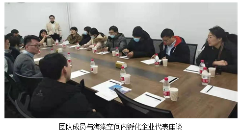 参观结束后,团队成员与海棠众创空间内的孵化企业代表进行了座谈,就导师创业、校企合作、培养人才、学生就业等问题展开了深入交流,通过座谈我们对行业发展、政策支持、企业发展及用人需求、就业创业运营模式等方面有了进一步了解,同时企业也对学校以及团队成员研发能力有了更详尽的认识,通过交流为下一步的校企合作打下了良好的基础。